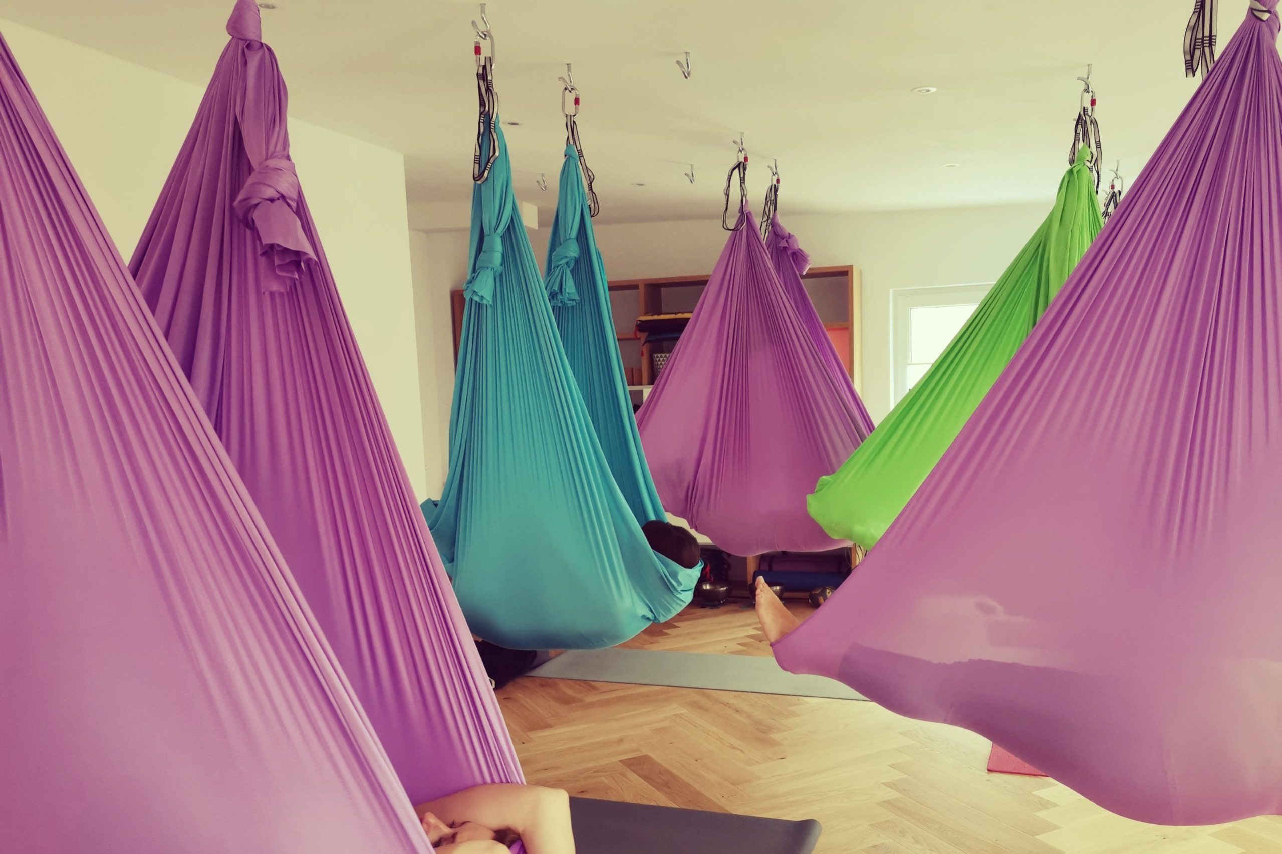 Die ersten Aerial-Yoga-Stunden in meinen neuen Räumlichkeiten.